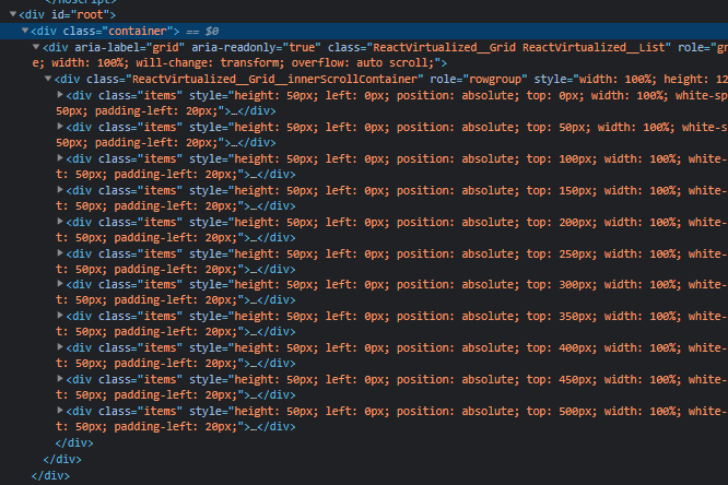 화면에는 10개의 데이터만 보이지만 실제로 2500개의 리스트가 한번에 렌더링되고, 불필요한 렌더링이 반복되면 프로그램이 느려지게 된다.